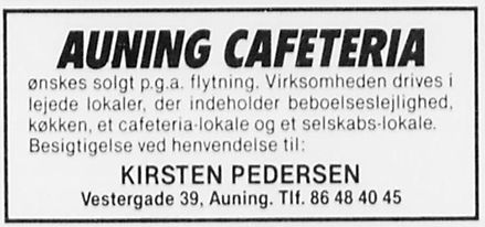 Auning Cafeteria har fået ny vært. Jonna Christensen, tidligere Søby, har forpagtet etablissementet efter at Ellone Kristensen, som ikke ønskede at forsætte som vært. Jonna Christensen har Mange års erfaring i restaurations branchen bag sig, og hun har bl.a. arbejdet på Den gamle Kro i Hornslet, OBS-cafeteriaet i Paderup og på en bodega i Egå, ligesom hun har stået for driften af Søby forsamlingshus. Sammen med sin mand Gert Christensen er den nye vært flyttet ind i privatboligen ved cafeteriaet, som vil blive drevet videre som hidtil. Der vil også fremover blive leveret mad ud af huset.