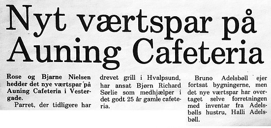 Teksten til dette klip fra Danders Dagblad den 23. april 1970 er følgende: Ved en reception i går åbnede det nye cafeteria Auning. Det er opført af Bruno Adelsbøll, der tid tigere har drevet cafeteriet i Ryomgård. For syv måneder siden blev byggeriet i Auning sat i gang, og byens borgere kan nu glæde sig over nogle meget smukke lokaler.