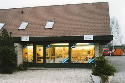 Et foto af den butik Chr. Stampe drev i en menneskealder i Torvegade 6. På facaden står der E. Stampe for Ejvind Stampe, som var søn af Chr. Stampe. I forgrunden ses 3 af Stampes lindetræer.