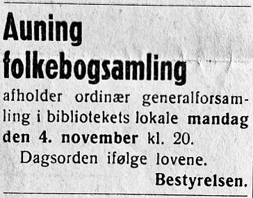 Her gengives tekste fra Randers Dagblad i 1923: Auning Sogns Sygeplejeforening holdt i aftes ordinær generalforsamling i Forsamlingshuset. Det reviderede regnskab, der balancerede med 2119 kr. 19 øre og udviste en kassebeholdning på 74 kr. 27 øre samt et i banken indestående beløb på 406 kr. 88 øre, fremlagdes og godkendes. Til Bestyrelsen valgtes i stedet for fru smed Kristensen og fru skrædder Bundesen, fru Marie Kristiansen og fru tømrer Høegh, begge af Auning, suppleant frk. Emma Maarup. For Tårup valgtes gdr. P. N. Pedersen i stedet for gdr. S. Nielsen, suppleant gårdejer N. M. Rasmussen.