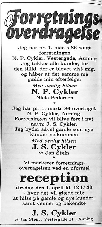 Omtale af forretningsoverdragelsen i 1986, formodentlig i Randers Amtsavis.